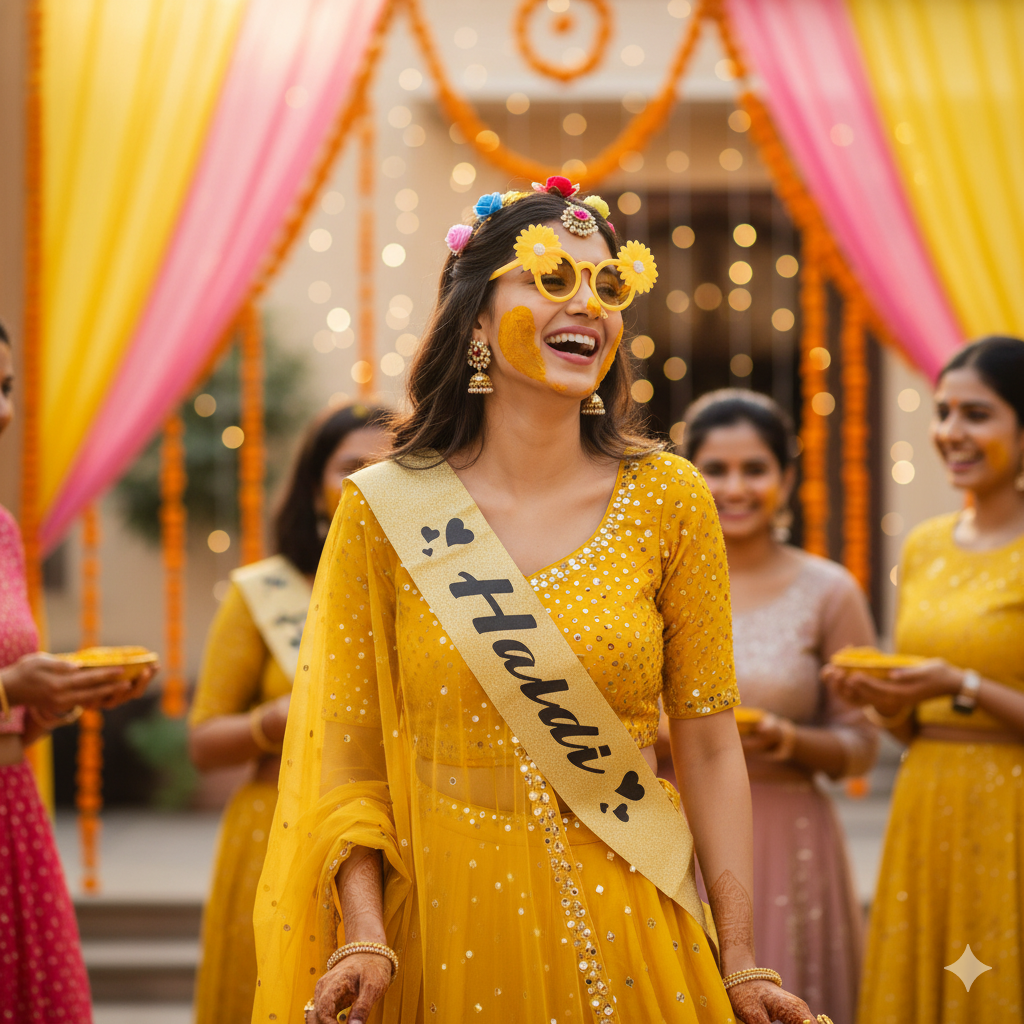 Bride Haldi Combo - Funky Goggles, Sash and Rose Tiara Celebrate the sunshine and joy...