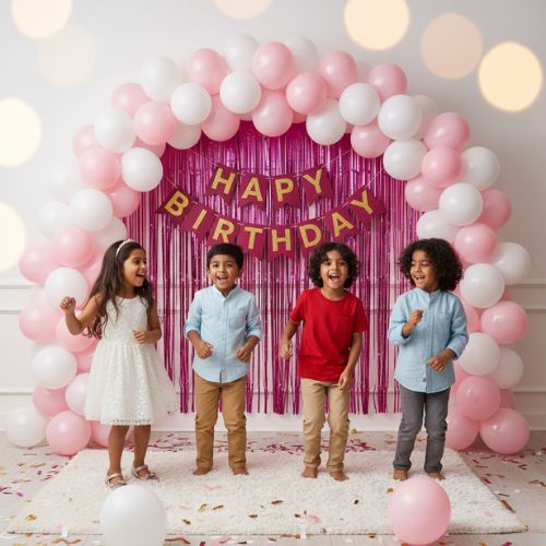 'Happy Birthday' Banner: Easy-to-hang banner with elegant pink accents.